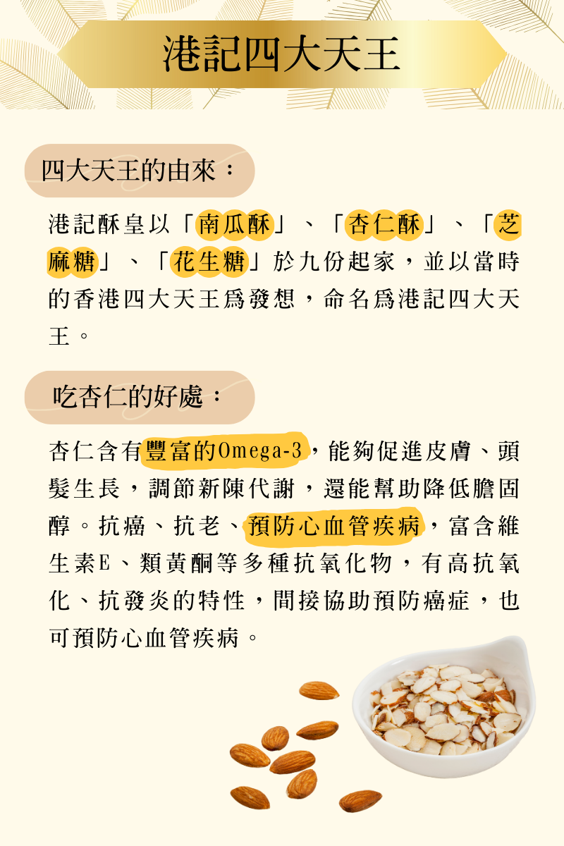 精製麥芽糖漿需長時間熬煮,與杏仁片炒熟,香氣濃鬱,形成酥脆不均勻的糖霜,配上杏仁的溫潤甜香,是清新宜人的零食首選。