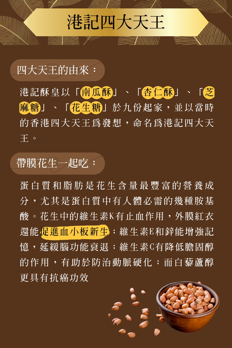特選頂級雲林沙特選頂級雲林沙地種植的花生,果實飽滿,香氣撲鼻,巧妙掌握花生與麥芽的溫度,讓花生糖香酥不黏牙!