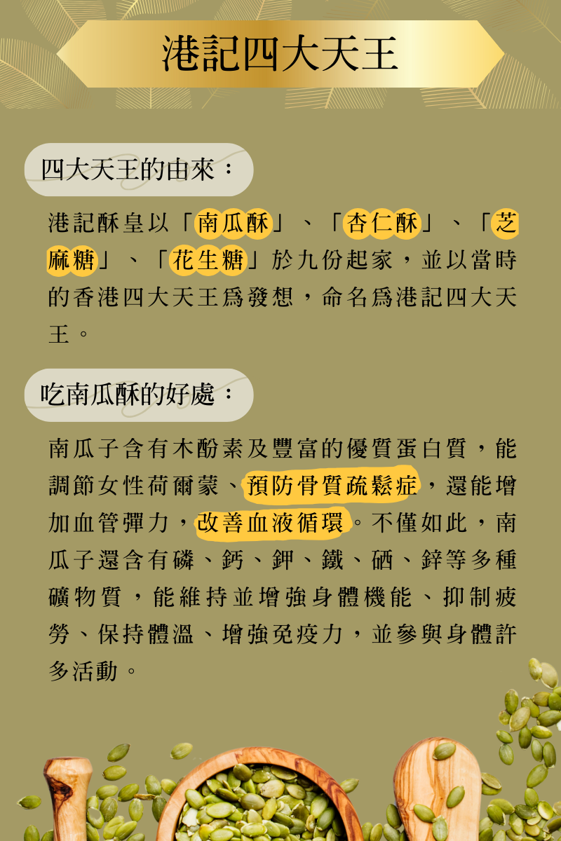 將嚴選厚實飽滿南瓜子翻炒至熟後,淋上甜而不膩的精質麥芽,南瓜子清香紮實飽滿,口感酥脆不黏牙,為品茗必備小點心。