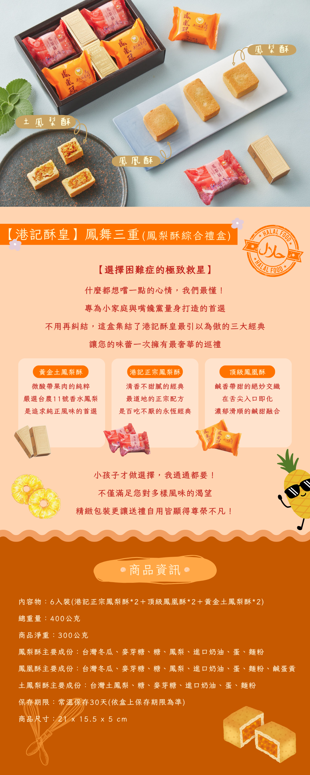 內容物:6入裝(港記正宗鳳梨酥*2+頂級鳳凰酥*2+黃金土鳳梨酥*2)